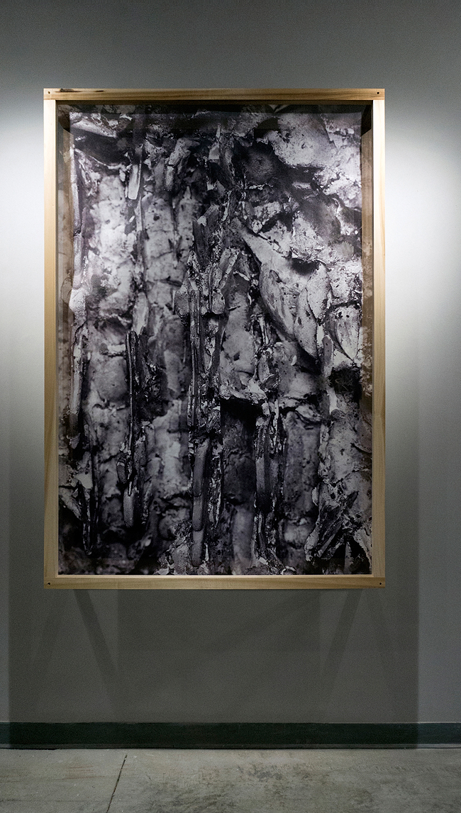 Passing beneath my very eyes: Chaenactis fremontii, 2018, 122cm x 183cm x 61cm (48" x 72" x 24"), poplar wood frame, double printed photographic image, semitransparent knitted polyethylene |