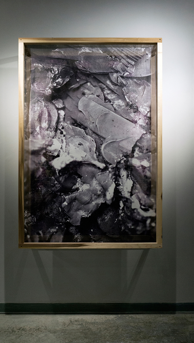Passing beneath my very eyes: Abronia villosa, 2018, 122cm x 183cm x 61cm (48" x 72" x 24"), poplar wood frame, double printed photographic image, semitransparent knitted polyethylene |