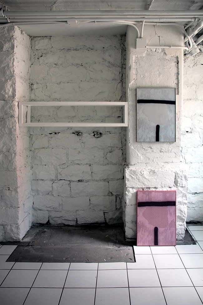Dull are the eyes (installation view), 2015, 69cm x 48cm (27" x 19"), diptych, mixed media stone lithographs (1/1), spray paint, bubble wrap, enamel, wood structure