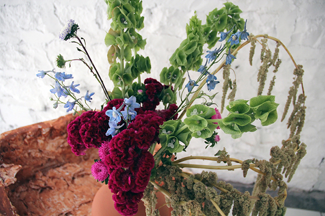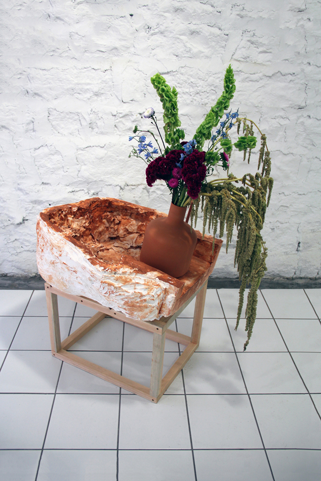 Empty vase with flowers, 2015, approx. 84cm x 102cm x 71cm (33" x 40" x 28"), sculpture 1 of 2, plaster mold, red clay pigment, iron vase, terracotta slip patina, mixed flowers, wood structure