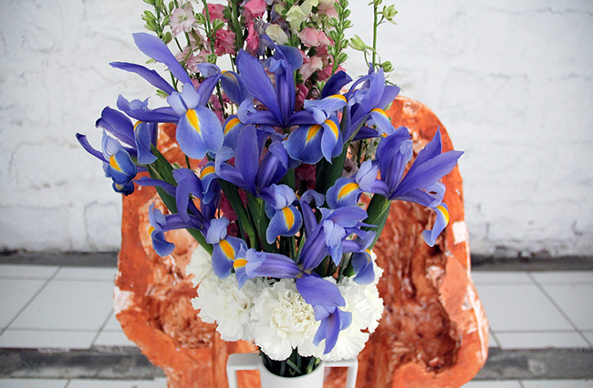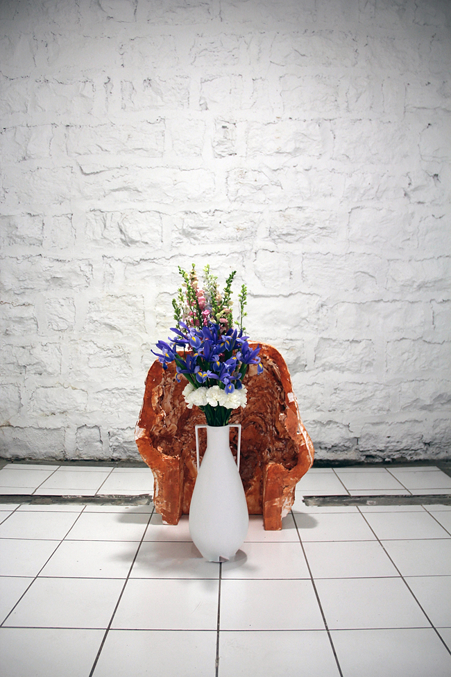 Empty vase with flowers, 2015, approx. 84cm x 91cm x 71cm (33" x 36" x 28"), sculpture 2 of 2, plaster mold, red clay pigment, porcelain vase with mixed flowers