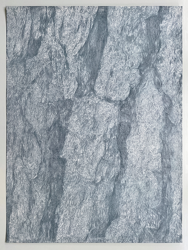 White Pine (dark indigo), 558 x 762mm, transfer drawing on paper, 2023.